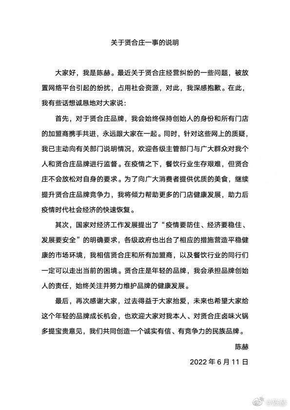 陈赫表示,对于贤合庄品牌,我会始终保持创始人的身份和所有门店的加盟商携手共进。同时,针对网上的质疑,已主动向有关部门说明情况。声明中还提到其会承担品牌创始人的责任,“相信贤合庄和所有加盟商一定可以走出当前的困境”。
