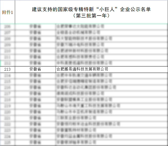 日前,国家工业与信息化部公布了“重点”国家级专精特新小巨人公示名单,合肥搬易通科技发展有限公司成功入选。这是继去年我司被认定为国家级专精特新“小巨人”企业后取得的又一项重要成绩。