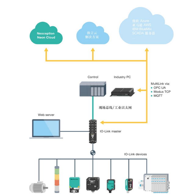 随着现代生产环境向智能制造的大规模转变,可通过使用倍加福 IO-Link 主站模块,对现有系统进行现代化改造。借助 OPC UA ,MQTT和云服务等更高级别的网络进行通信。RFID和光电传感器连接至倍加福ICE3 IO-Link主站模块上,通过ICE3模块的“多链路”功能,同时与PLC和光伏公司的MES系统做通信。