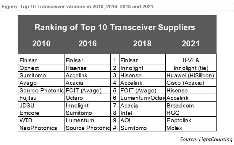 全球光模块供应商TOP10最新排名:中国厂商首登第一