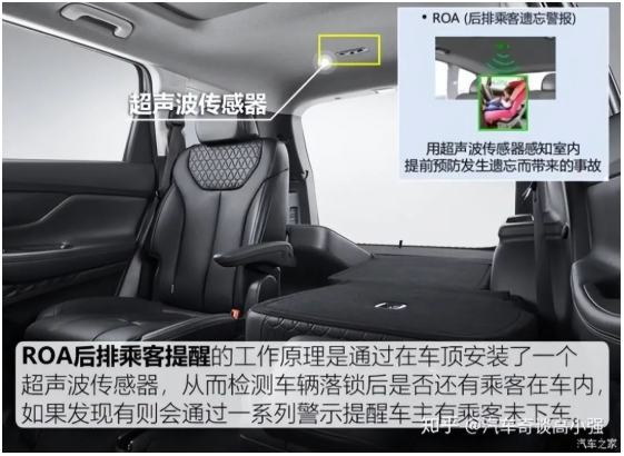 后来,市面上出现了更为复杂的解决方案,比如现代、日产等采用的ROA后排乘客提醒。其原理是:车内安装超声波传感器,能在锁车后检测是否还有孩子活动,一旦检测到活体存在就会通过鸣笛、信息推送到手机等方式提醒车主。