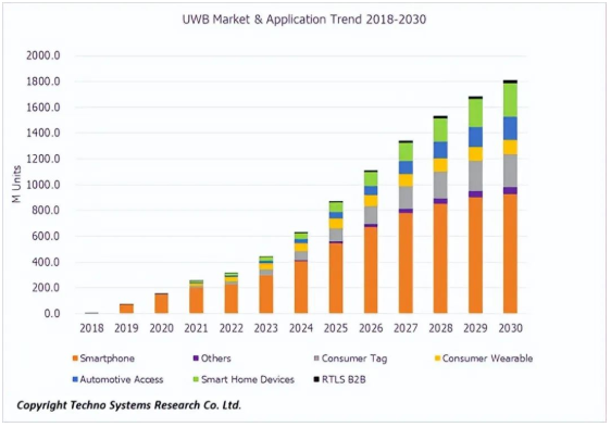 据Techno Systems Research发布的报告,预计到2022年,全球UWB市场出货量将超过3.167亿台。到2030年,智能手机将成为UWB的最大应用领域,其次是智能家居、消费标签、汽车、消费可穿戴和RTLS B2B。