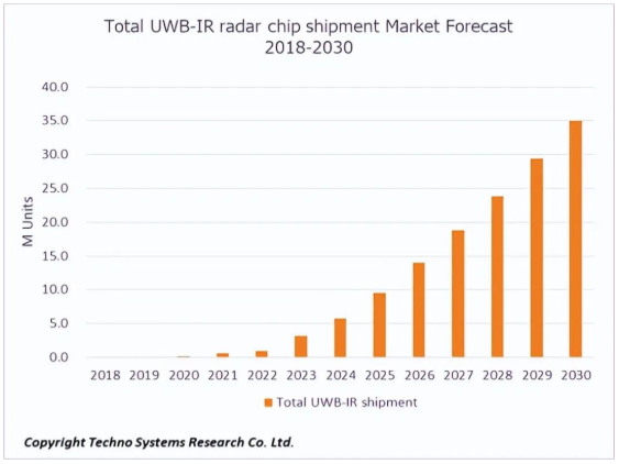 在紧急情况下,在集合区域的M2M防撞存在检测、H2M存在检测和防撞(区域外)和病人监控也会是UWB-IR雷达发挥作用的方面。预计到2030年,UWB雷达芯片市场将达到3490万片。