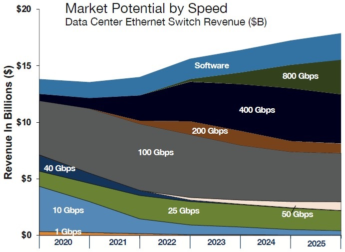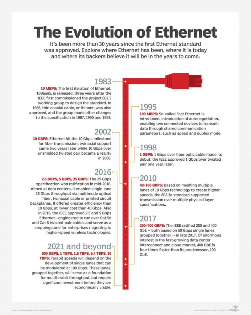 过去几十年见证了以太网速度从 1G、10/25G 到 40/100G 的转变,以太网行业不断创新以实现更高的网络速度,如 400G 和 800G。