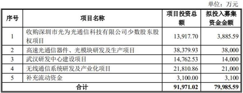 去年底,通宇通讯采用非公开发行股票的方式向特定投资者共计发行价值约8亿元普通股股票,发行价格为12.64元/股,用于收购深圳市光为光通信科技有限公司(下称“光为光通信”)少数股东股权项目、高速光通信器件、光模块研发及生产项目、武汉研发中心建设项目、无线通信系统研发及产业化项目等。