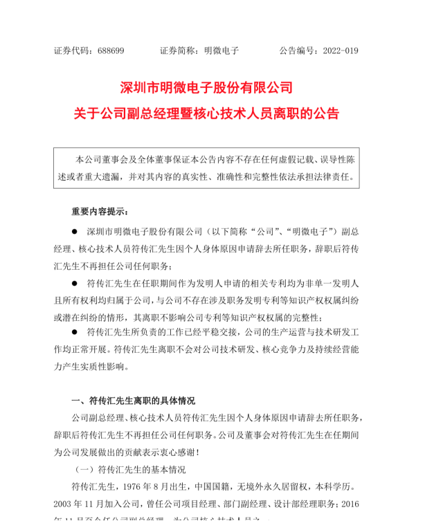 明微电子又一高管变动:副总经理暨核心技术人员离职