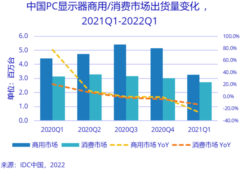 本文引用地址:http://www.eepw.com.cn/article/202206/435135.htm根据IDC《中国PC显示器市场季度跟踪报告,2022年第一季度》,2022年第一季度中国PC显示器出货量599万台,同比下降20.7%。疫情的反弹对商用市场订单以及消费者支出结构的影响,导致了市场需求低迷。