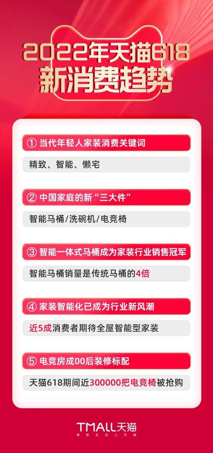 天猫新生活研究所最新发布的《2022年天猫618新消费趋势》显示,精致、智能和懒宅,成为当代年轻人居家生活消费新趋势。伴随着年轻人越来越追求生活的仪式感、精致感,洗碗机、智能马桶和电竞椅成为中国家庭的“新三大件”,堪称“家的新刚需”。