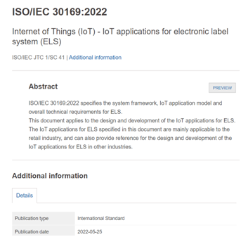 近日,由BOE(京东方)牵头制定的“ISO/IEC 30169:2022 Internet of Things (IoT) - IoT applications for electronic label system (ELS)”(《物联网-电子标签系统的物联网应用》)通过国际物联网权威标准组织ISO/IEC JTC1 SC41正式发布。作为中国智慧零售行业首个物联网国际标准,以及全球首个电子标签系统物联网应用国际标准,此标准的发布不仅填补了行业空白,为行业规范化发展和技术升级提供了标准支撑,更彰显了BOE(京东方)在全球智慧零售市场的领导力和物联网应用领域的强大创新实力。