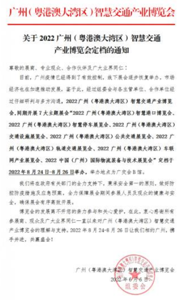 2022广州(粤港澳大湾区)智慧交通产业博览会暨创新发展论坛将于8月24-26日正式举办,同期将开展“七大主题”展会“2022 广州(粤港澳大湾区)智慧港口博览会、2022 广州(粤港澳大湾区)智慧停车展览会、2022 广州(粤港澳大湾区)交通设施展览会、2022 广州(粤港澳大湾区)公共交通展览会、2022 广州(粤港澳大湾区)轨道交通展览会、2022 广州(粤港澳大湾区)车联网产业展览会、2022 中国(广州)国际物流装备与技术展览会”,举办地点为广交会展馆。