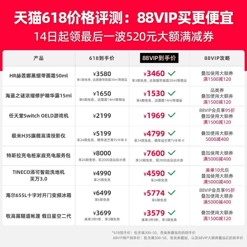 记者实测显示,在计算完跨店满减等权益后,下单一台Switch OELD游戏机,88VIP用户可再叠加95折及大额劵,最终只需实付1969元,又多省出230元;购买一台海尔655L十字对开门变频冰箱,88VIP用户叠加95折及大额劵,又能多省出725元。