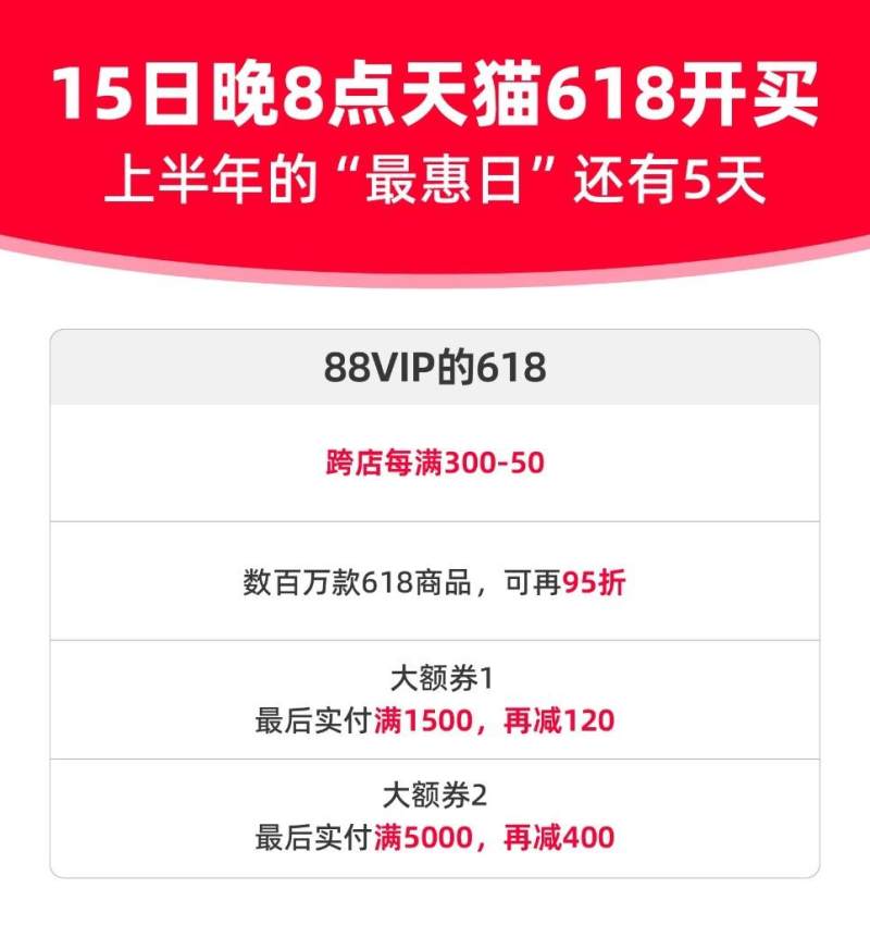 上半年的“最惠日”还有5天,把心爱之物以超值价格收入囊中,“大鹅券”依然是最关键的那把钥匙。14日零时起,天猫再次发放520元专属大额券。今年88VIP的618满减权益,除了可跨店每满300减50外,还能再享部分商品95折,以及在订单最终实付满1500元、5000元情况下分别再减120元、400元。