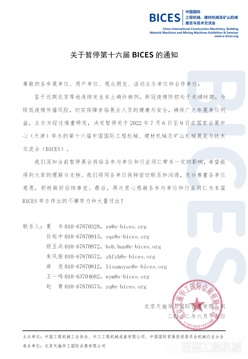鉴于近期北京等地连续发生本土确诊病例,新冠疫情防控处于关键时期,为降低疫情传播风险,切实保障亲临展会人员的健康与安全,确保广大参展单位利益,主办方经过慎重研究,决定暂停定于2022年7月6日至9日在国家会展中心(天津)举办的第十六届中国国际工程机械、建材机械及矿山机械展览与技术交流会(BICES)。