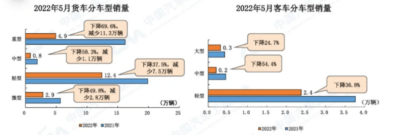 1-5月,商用车产销142.2万辆和142.1万辆,同比下降39.4%和41.9%。在商用车主要品种中,与上年同期相比,客车和货车产销均呈较快下降。