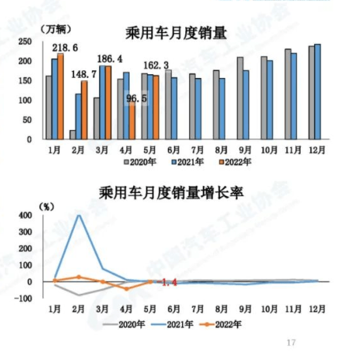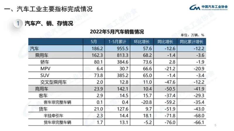 钛媒体6月10日消息,据中国汽车工业协会发布的数据显示,2022年5月,汽车行业销量预计完成192.6万辆,环比增长59.7%,同比下降5.7%;2022年1~5月,累计销量961.8万辆,同比下降9.6%。