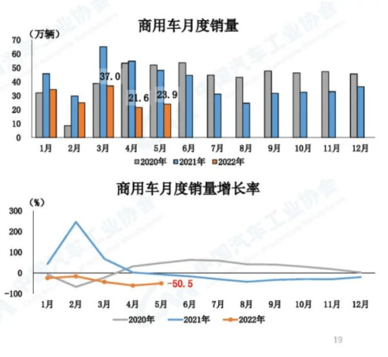 5月,商用车产销22.5万辆和23.9万辆,环比增长7.2%和10.4%,同比下降47.0%和50.5%。在商用车主要品种中,与上月相比,货车和客车产销均呈增长,其中客车增速更为明显;与上年同期相比,客车和货车产销依然呈较快下降。