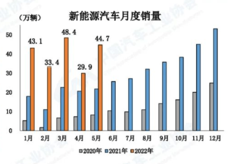 5月,新能源汽车产销表现也较为出色,当月产销分别达到46.6万辆和44.7万辆,环比增长49.5%和49.6%,同比增长均为1.1倍,市场占有率达到24.0%。在新能源汽车主要品种中,与上月相比,纯电动汽车、插电式混合动力汽车、燃料电池汽车产销均呈增长,其中纯电动汽车增速更为明显;与上年同期相比,上述三大类品种产销均呈高速增长,燃料电池汽车增速依旧最为显著。
