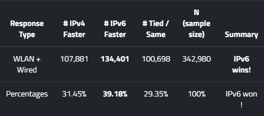 表 - 1:IPv4 与 IPv6 总延迟对比