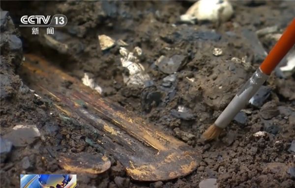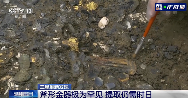 考古人员称,此前还未见过这种形态的器型,有一个弧形的刃,有点斧子的造型,暂定名“斧形金器”。由于只挖掘了一角,仍有一部分埋在土中需要清理,所以最终形态还不确定。