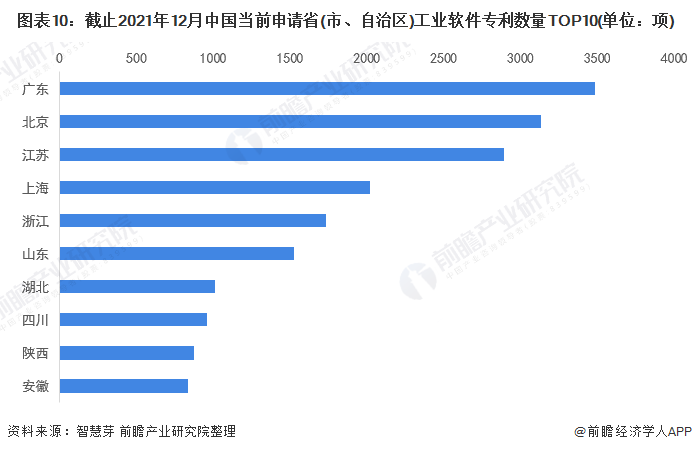 图表10:截止2021年12月中国当前申请省(市、自治区)工业软件专利数量TOP10(单位:项)