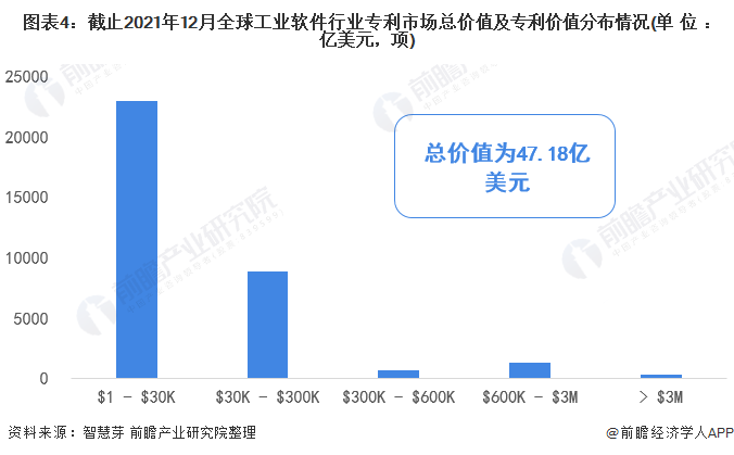 4)全球工业软件行业专利市场价值:总价值接近50亿美元,3万美元以下专利数量较多