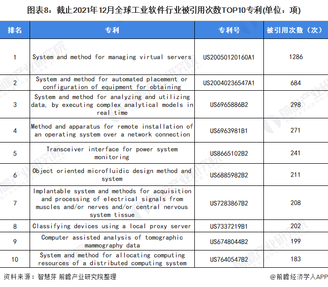图表8:截止2021年12月全球工业软件行业被引用次数TOP10专利(单位:项)
