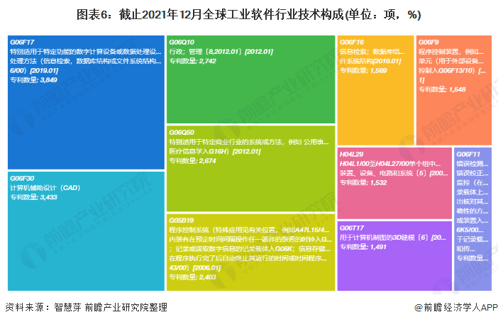 图表6:截止2021年12月全球工业软件行业技术构成(单位:项,%)