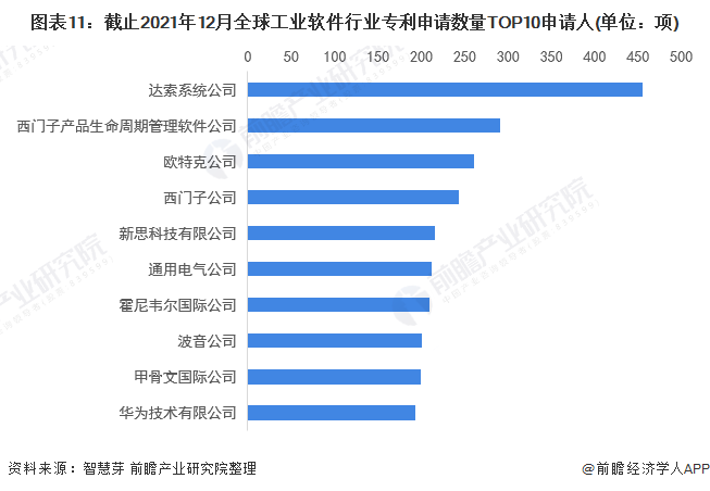 图表11:截止2021年12月全球工业软件行业专利申请数量TOP10申请人(单位:项)
