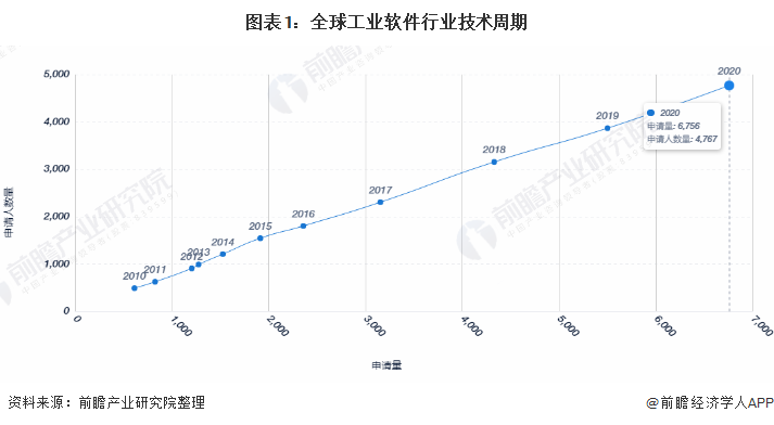 2010-2020年全球工业软件行业专利申请数量呈现逐年增长态势2,020年申请量达到为6756项。