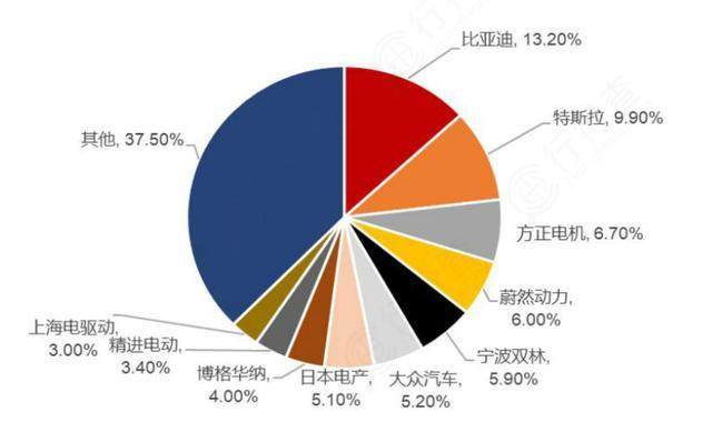 前十企业中,整车企业驱动电机市场份额合计34.3%,第三方独立电机公司驱动电机市场份额28.1%。