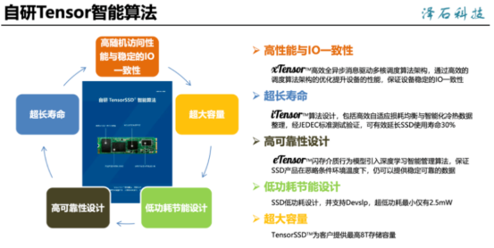主控方面,除了控制器芯片,泽石在TensorECC纠错引擎方面有独到优势,能够自适应不同NAND特性,降低产品成本30%,纠错能力提升3-5倍;应用感知TensorComp引擎针对AI图像识别等大数据应用,无损压缩数据20%以上;高带宽TensorProc引擎,可加速大数据计算存储处理,降低系统功耗。