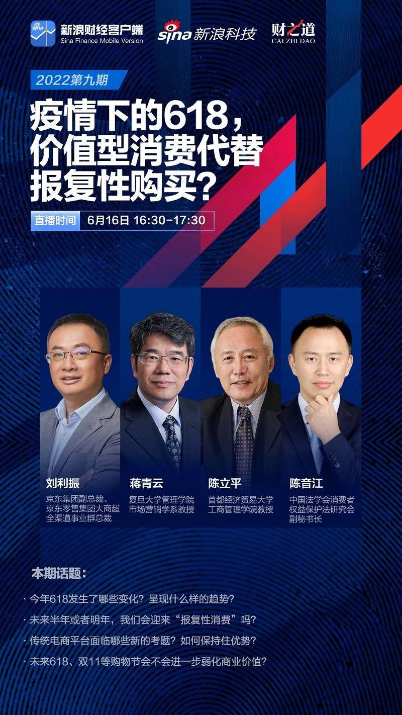 6月16日,新浪《财之道》栏目邀请京东集团副总裁、京东零售集团大商超全渠道事业群总裁刘利振、复旦大学管理学院市场营销学系教授蒋青云等专家和行业协会负责人,以“疫情之下618,价值性消费代替报复性购买?”为主题共同探讨交流了今年618的消费趋势和玩法变化,以及未来消费市场发展方向。