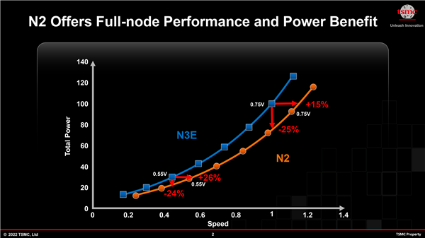 技术指标方面,台积电披露,N2相较于N3,在相同功耗下,速度块10~15%;相同速度下,功耗降低25~30%,开启高效能新纪元。