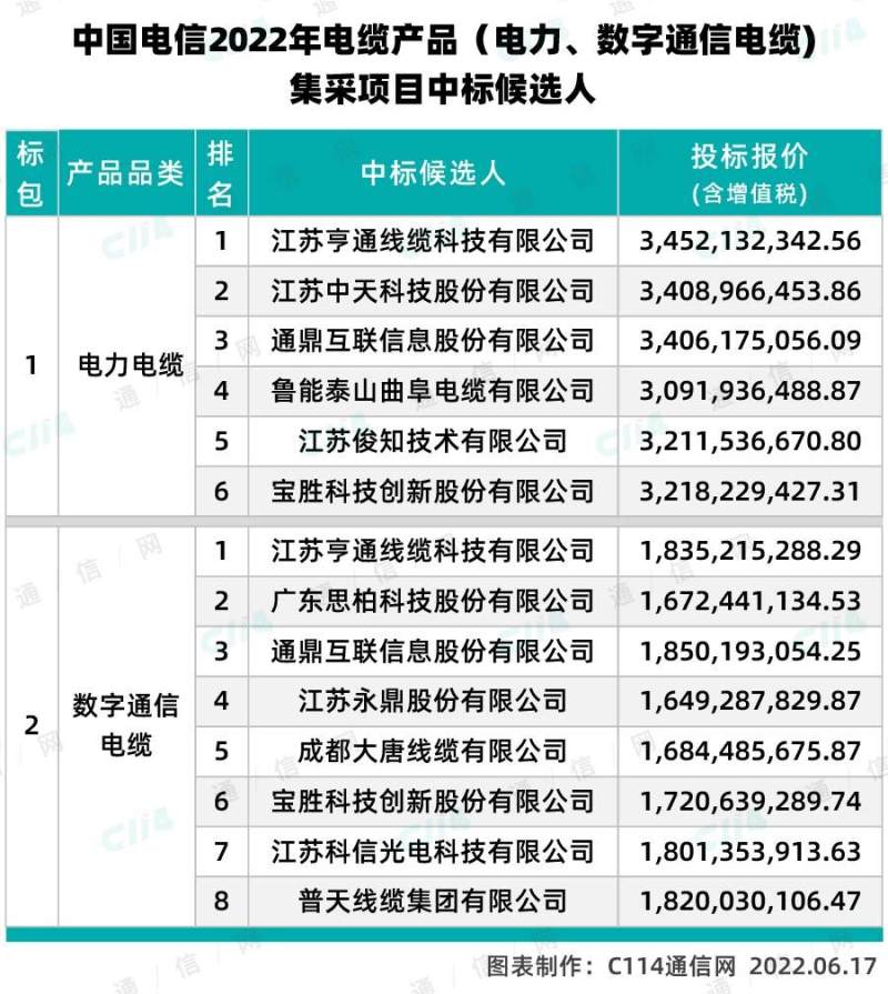 C114讯 6月17日消息(水易)来自中国电信官方消息,中国电信2022年电缆产品(电力、数字通信电缆)集中采购项目评标委员会按照招标文件载明的评标方法和标准已完成对各投标人递交的投标文件的评审。评审结果显示,亨通、中天、通鼎互联等11家厂商入围。