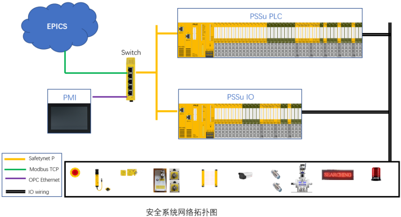 PSS4000与EPICS系统,通过ModbusTCP协议,进行数据交互。交互数据包括:所有的门限位状态点、门锁状态点、机械联锁钥匙状态点、搜索按钮状态点、急停状态点、自动搜索状态点、光闸状态点、复位状态点、开闭光闸按钮状态。管理员安全许可、EPS和储存环许可、所有光闸驱动点、声光报警点、LED屏状态幕点、故障报警点、急停报警点等。