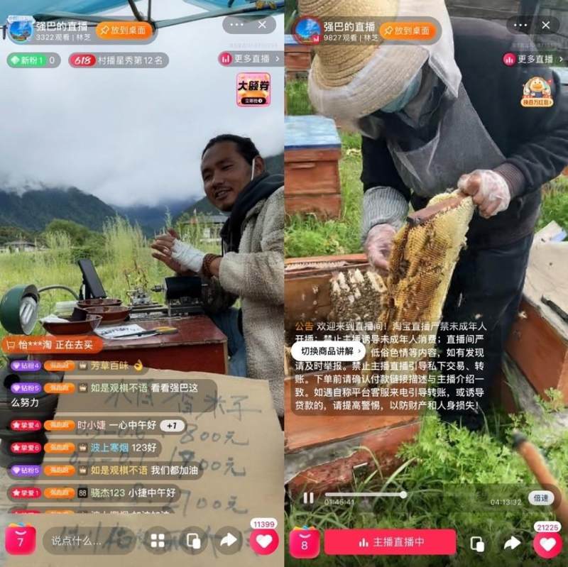 而远在青藏高原,淘宝主播藏族大姐扎西卓玛、藏族小哥强巴等同样在开播。在强巴的直播间,可以看到背景就是林芝壮美的自然风光,有时他还会开车带大家去到蜂农家中直击采蜜现场,现场直播采蜜、摇蜜、装蜜的全过程。