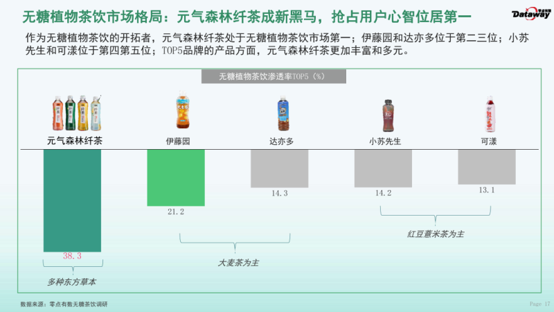 元气森林纤茶作为无糖植物茶饮品牌表现抢眼,多维度层面位居第一:在无糖茶饮品牌力排行中,纤茶反超老牌国货农夫山泉东方树叶位居第一;此外,在无糖植物茶饮的市场格局排行中,纤茶作为赛道开拓者以38.2%的市场份额位居第一。