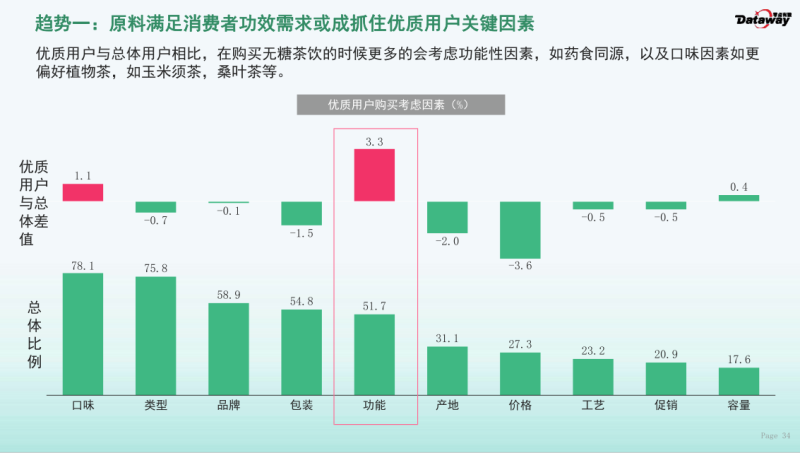 《报告》显示,原料满足消费者功效需求或成抓住优质用户关键因素,在购买无糖茶饮的时候更多的会考虑功能性因素, 比如药食同源。