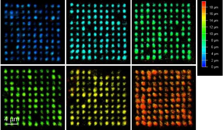 研究团队提出一种基于透明胶带的激光诱导荧光漂白实现超大容量光存储的新方案。利用兼具无色和荧光特性的聚集诱导发光(Aggregation-induced emission, AIE)材料四苯基乙烯配置饱和溶液,将去掉胶后的一小块透明胶带浸泡其中,并用超声振荡的方式让四苯基乙烯尽可能多的溶解。实验发现,在室温环境下浸泡一段时间并清除掉表面所沉淀的染料分子后,四苯基乙烯分子由于分子热运动会扩散到透明胶带内部,利用激光诱导双光子荧光漂白可实现数据记录。实验中记录了6层10*10的二进制数据点阵,并利用共聚焦显微镜进行数据读取,其中,不同的颜色代表了不同的存储深度。该成果首次将AIE材料成功应用于光存储,进一步拓宽了AIE材料的应用领域。同时,由于透明荧光胶带具有体积小、可制作长尺寸等特点,可实现超大容量光存储。