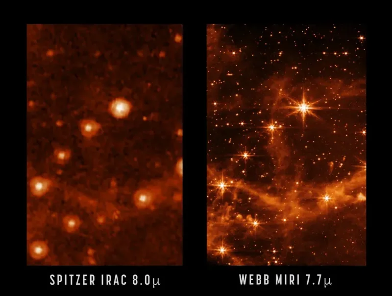 射电天文学家已经发现了一些迹象,表明有些星系完全被尘埃隐藏,并且无法被像哈勃这样的望远镜探测到,这些望远镜捕捉到的光波长与人眼可见的波长相似。极冷的温度使 MIRI 对中红外范围内的光非常敏感,可以更容易地穿过灰尘。当这种敏感性与韦伯的大镜子相结合时,它允许 MIRI穿透这些尘埃云,并首次揭示这些星系中的恒星和结构。