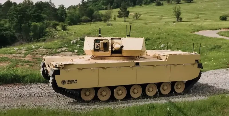 尽管测试中使用了一门Bushmaster 30毫米火炮并采用了无链式供弹,但Type-X可以携带高达50毫米的火炮及反坦克导弹和用于侦察的系留无人机。Milrem组件是一个融合了AI能的推进和控制模块,进而能够进行自主航点导航和障碍物探测。此外,它还具有间接驱动功能,可以在更高的速度下提供更好的远程控制。