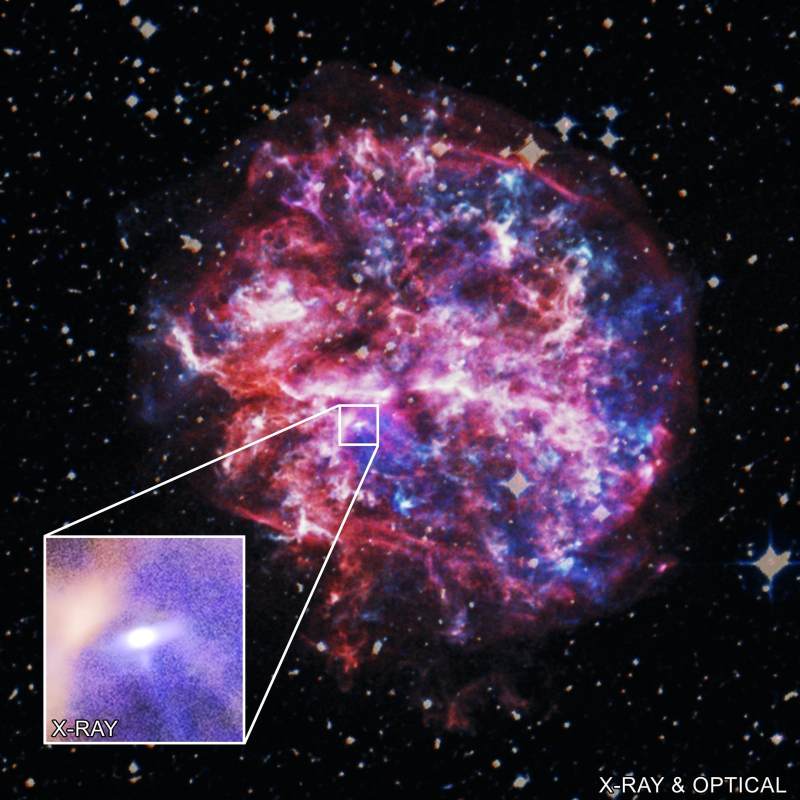 脉冲星是快速旋转的中子星,当大质量恒星的燃料耗尽、坍缩和爆炸时就会形成。有时这些爆炸会产生一个“踢”的动作,这就是让这颗脉冲星在超新星爆炸的遗迹中飞奔的原因。一个插图显示了从钱德拉发出的X射线中看到的这个脉冲星的特写。