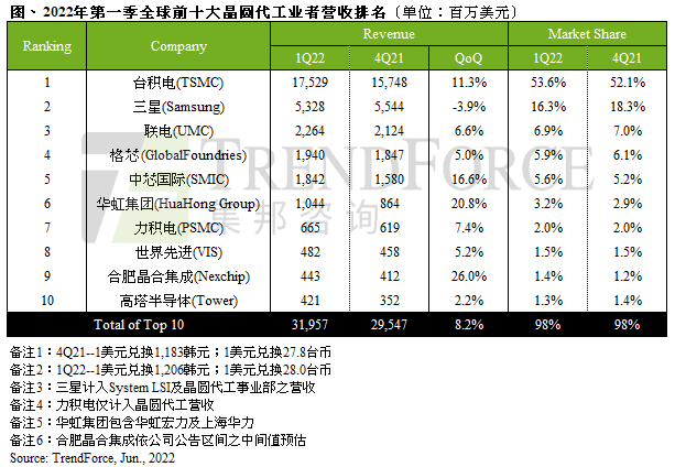 第六至第八名依序为华虹集团(HuaHong Group)、力积电(PSMC)、世界先进(VIS),分别受惠于产能利用率持续满载、新产能开出、平均销售单价及产品组合调整,营收表现皆有成长。合肥晶合集成第一季营收达4.4亿美元,季增26.0%,成长幅度为前十大业者最高,同时也超越高塔半导体(Tower)跃居第九名,更拉近与第八名世界先进之间的市占差距。据TrendForce集邦咨询了解,合肥晶合集成目前以生产0.1Xμm及90nm大尺寸驱动IC为主,而2022年也将延续积极扩产的基调,目标完成N2厂区产能建置。同时,为降低单一市场景气下行循环可能的风险,亦加速开发TDDI、CIS、MCU与PMIC等多元产品平台脚步,目前合肥晶合集成已与SmartSens合作成功开发90nm CIS产品,量产后将能贡献非驱动IC营收。