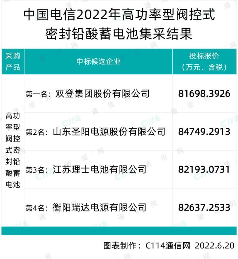 C114讯 6月20日消息(焦焦)从中国电信官网获悉,中国电信日前公示了2022年高功率型阀控式密封铅酸蓄电池的中标结果,双登集团、山东圣阳电源、江苏理士电池、衡阳瑞达电源4家入围。