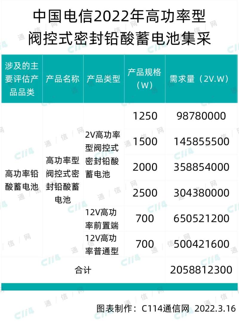 据此前中国电信发布的预审公告称,本次高功率型阀控式密封铅酸蓄电池采购为中国电信集团有限公司和中国电信股份有限公司及其下属的子公司、分公司在2022年7月至2024年6月各工程中所需的高功率型阀控式密封铅酸蓄电池。