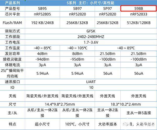 S98B尺寸小巧,全端口引出,使用便捷。除了支持常规蓝牙5.1以外,还支持Long range协议,使通讯距离变远。该模组还配备了一个FAN功能块,使输出功率更强。