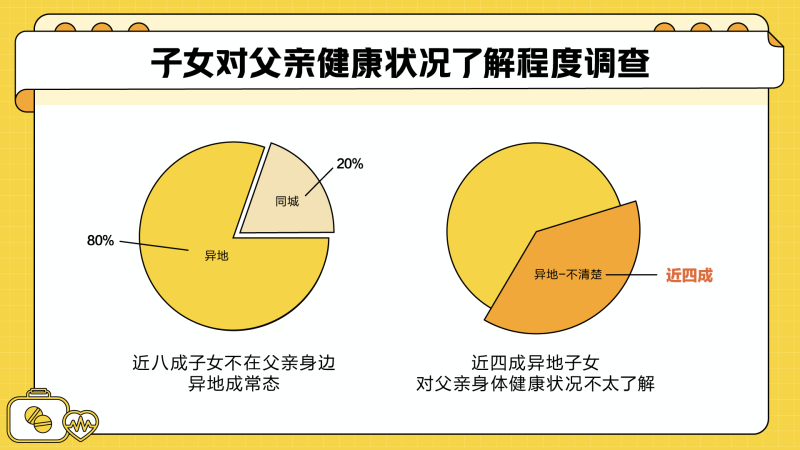 慢性病一直是中老年人群健康的最大困扰,公开数据显示,我国老年人患慢性病几率达到75.23%,大致有1.9亿老年人患有慢性病,其中中老年男性因生活习惯等问题,慢性病患病率更高。调研显示,近八成子女和父亲分隔两地,其中近四成子女对父亲的身体健康状况的了解程度较低。