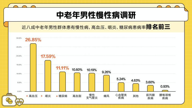 《中老年男性群体健康状况调研》结果显示,在中老年男性身体健康调查中,高血压、咽炎、糖尿病的患病率排名前三,其中高血压在中老年男性人群体中最为普遍。