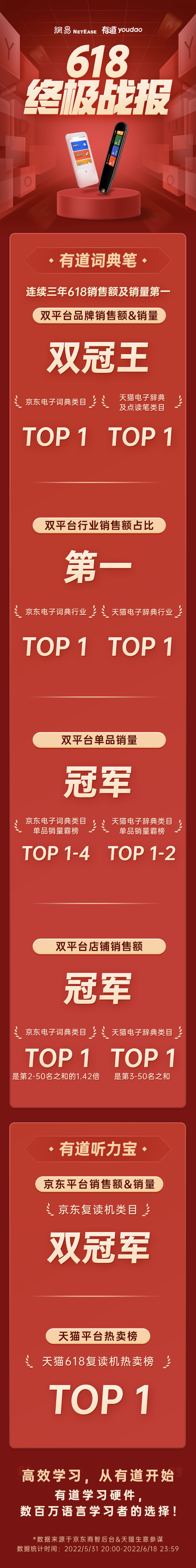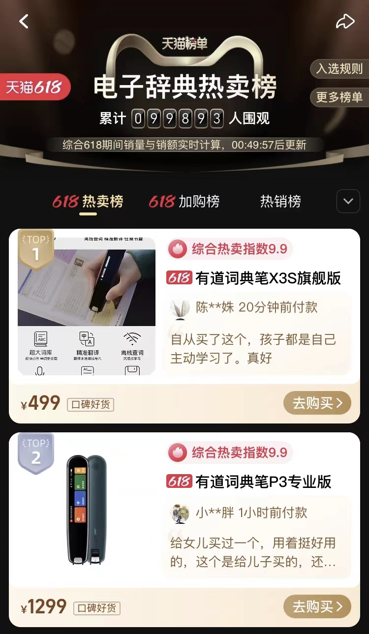 随着618大促的深入进行,有道学习硬件的销售更是一骑绝尘,遥遥领先其他品牌。最终,在天猫和京东发布的618终极战报中,有道词典笔以一连串的“第一”,证明了有道行业领军者的超强实力。