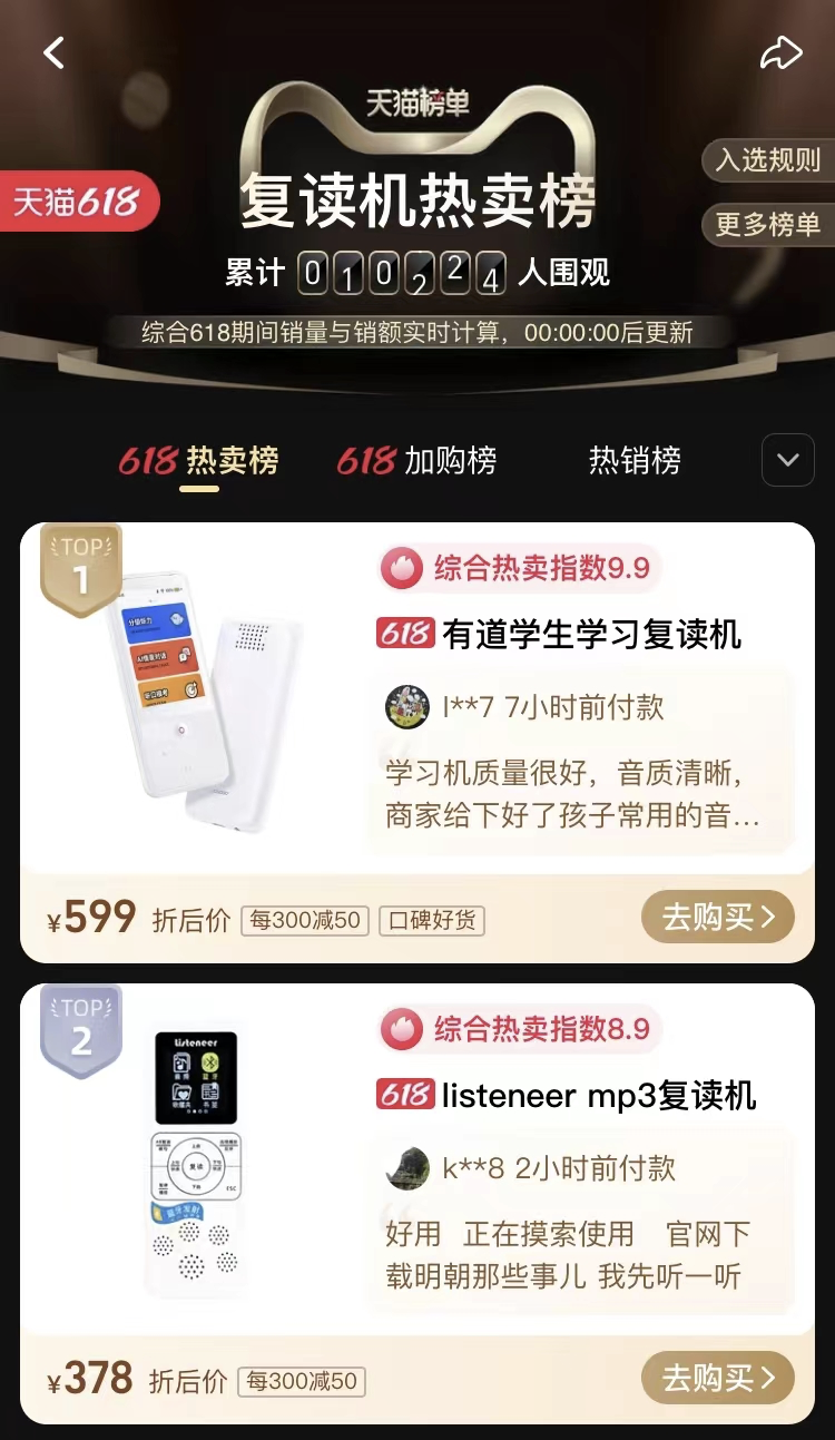 一出手便是“王炸”,这是网易有道的成功之道,其学习硬件矩阵中均是深受市场欢迎的“人气王”。例如今年表现惊艳的明星产品听力宝,集好方法、好内容与好工具属性于一体,带来了全新的系统性学习模式,充分运用AI技术,让英语听说能力的训练更高效,让用户在定制化的学习体验中获得质的提升,天猫618“复读机类目销售额第一”、京东618“复读机类目销售额、销量双第一”的好成绩,说明了它的用户认可度。
